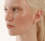 A sleek climber earring, crafted from sterling silver with an 18k gold plating, offers a unique and slender silhouette. This distinct piece climbs elegantly up the ear, adorned with a minimalist design that captures the essence of modern sophistication. Perfect for those seeking a subtle yet striking statement.